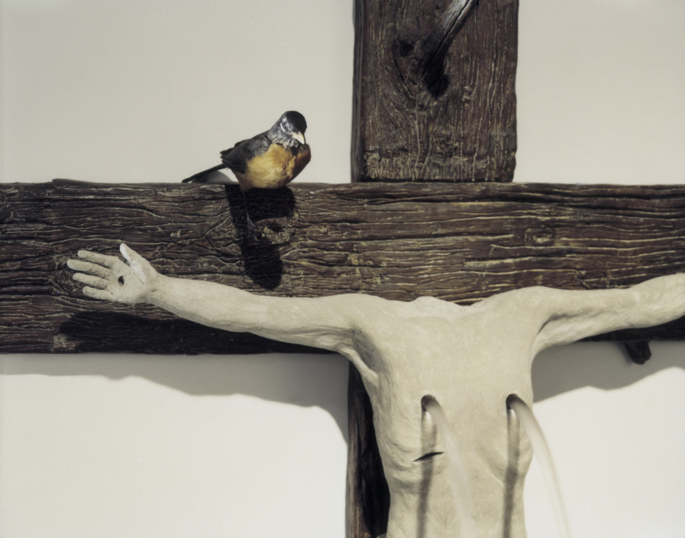 While Gober’s work addresses universal themes of loss and longing, his personal experiences deeply inform his art, charging each work with an acute sense of intimacy. Among his best-known works are his immersive installations, the first of which, created in 1992 at the Dia Center for the Arts in New York, included a barred window set high in a wall, bundles of hand-printed newspapers, and sculptures of sinks complete with running water, among other elements. For his 1997 exhibition at the Museum of Contemporary Art in Los Angeles, Gober made an installation with a wooden staircase ascending up the back wall, its steps rendered inaccessible by a cascade of flowing water, while three storm drains set in the floor offered glimpses of lifelike tide pools below. The installation for his 2005 exhibition at Matthew Marks Gallery comprised eight drawings and fifteen sculptures arranged in rows like the pews of a chapel, leading to a large cross bearing a headless concrete crucifix with water pouring out of its nipples. On either side, a door slightly ajar revealed a bathtub with human legs cast in beeswax just visible above the water.