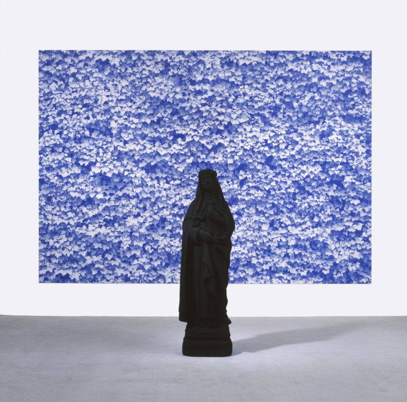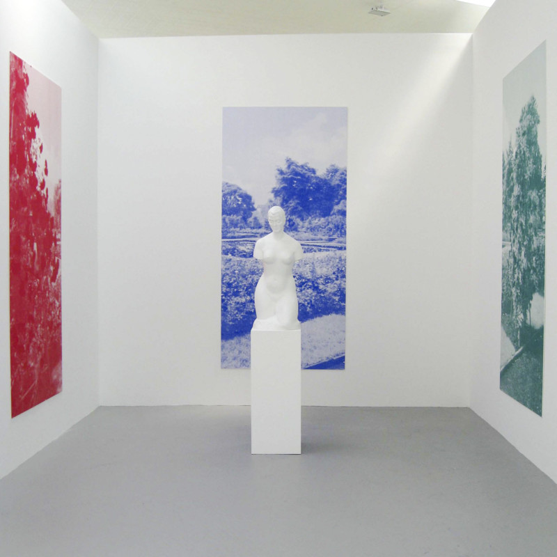 Polyester and acrylic paint on MDF pedestal and oil-based ink and acrylic on three plastic panels