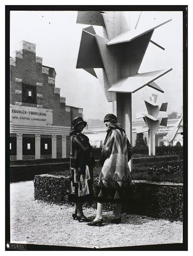 Robert Mallet-Stevens Models wearing dresses by Sonia Delaunay photographed in front of the concrete trees by the Martel Brothers 1925